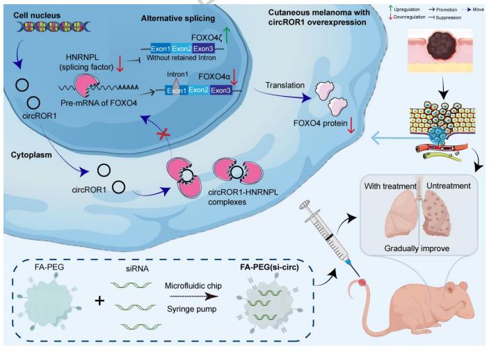 黑色素瘤具有高度侵袭性与转移倾向,转移机制复杂且治疗挑战突出。近年来,circRNA因其稳定性强、组织特异性显著,被认为是肿瘤转移的重要调控因子与潜在干预靶点,但其在黑色素瘤转移过程中的关键circRNA分子及下游剪接网络仍有待深入解析。该研究围绕CircROR1展开系统研究,提出其在黑色素瘤转移中所发挥的核心促癌作用,并形成“circRNA—RBP—剪接调控—转移表型—纳米递送治疗”的完整证据链。