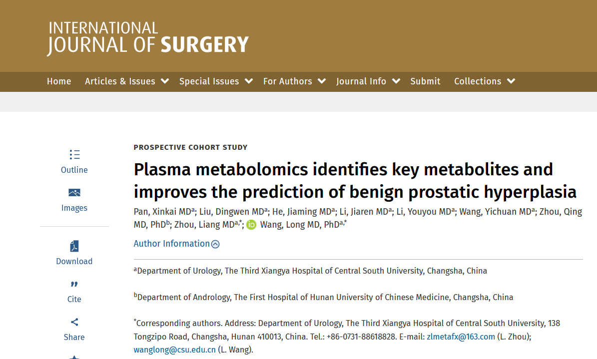 2026年2月,中南大学湘雅三医院泌尿外科王龙教授团队在国际外科学权威期刊《国际外科学杂志》(International Journal of Surgery,IF=10.1)发表题为《基于血浆代谢组学的良性前列腺增生关键代谢物发现与预测优化(Plasma Metabolomics Identifies Key Metabolites and Improves the Prediction of Benign Prostatic Hyperplasia)》的原创性研究论文。中南大学湘雅三医院为论文第一及通讯作者单位,泌尿外科王龙教授和周亮博士研究生为共同通讯作者,潘昕凯硕士研究生为独立第一作者。