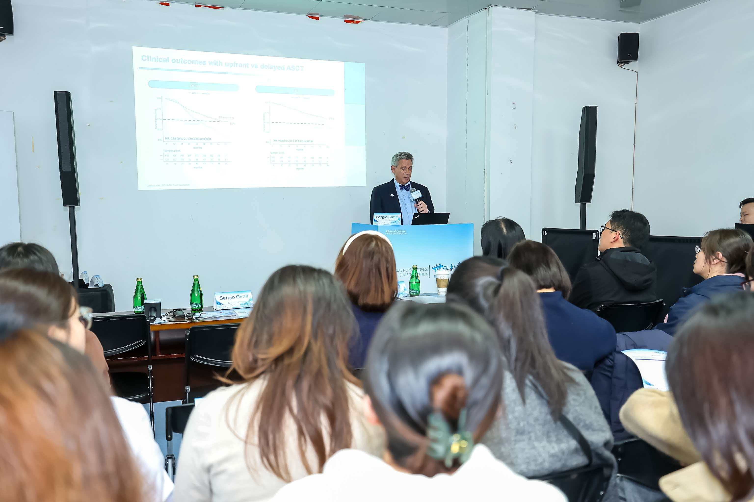 会议由血液内科主任李昕主持,特邀西班牙萨拉曼卡大学医院骨髓瘤项目主任María-Victoria Mateos教授线上分享。Mateos教授长期致力于临床试验设计与推进,尤其在不适合移植及冒烟型骨髓瘤患者的治疗策略方面积累了丰富经验。她围绕“整合免疫治疗路径”这一主题,系统阐述了如何通过不同治疗手段的有机结合,优化患者的整体治疗旅程。美国纪念斯隆-凯特琳癌症中心血液恶性肿瘤部主任Sergio Giralt教授亲临现场。作为该院临床首席医疗官,Giralt教授在骨髓移植、多发性骨髓瘤、白血病和淋巴瘤等领域深耕多年。他聚焦“维持治疗策略”,深入阐释了在移植与非移植背景下,如何通过强化诱导和持续治疗来改善患者的长期预后,并与现场专家展开面对面的深度交流。