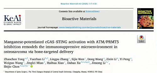 近日,中南大学湘雅三医院脊柱外科陈世杰教授、李劲松副教授团队在国际权威学术期刊《Bioactive Materials》(生物活性材料,中科院一区,Top期刊,影响因子20.3)发表题为 “Manganese-potentiated cGAS–STING activation with ATM/PRMT5 inhibition remodels the immunosuppressive microenvironment in osteosarcoma via bone-targeted delivery”(锰增强的 cGAS-STING 激活联合 ATM/PRMT5 抑制,通过骨靶向递送重塑骨肉瘤中的免疫抑制微环境)的原创研究论文。中南大学湘雅三医院为该论文第一作者单位及通讯作者单位,脊柱外科2022级博士研究生仝昭宸、李岳湛为论文共同第一作者,李劲松副教授、陈世杰教授为论文共同通讯作者。
