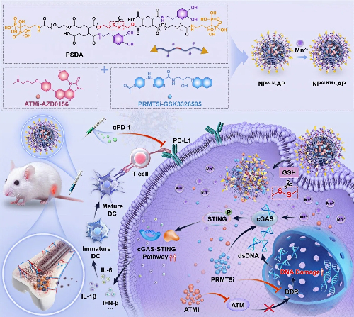 骨肉瘤是儿童和青少年常见的原发性恶性骨肿瘤,复发、转移、化疗耐药及免疫治疗反应不足仍是临床治疗中的重要难题。针对骨肉瘤骨组织递药受限、DNA损伤修复能力较强及免疫抑制性肿瘤微环境等问题,研究团队构建了一种兼具骨靶向递送、谷胱甘肽响应释放和锰离子免疫放大功能的纳米平台NPALN/Mn-AP。该平台可同时递送ATM抑制剂AZD0156、PRMT5抑制剂GSK3326595,并通过多巴胺结构螯合Mn²⁺,在骨肉瘤细胞内高谷胱甘肽环境下实现响应性释放,从而协同增强DNA损伤积累、激活并放大cGAS-STING信号通路。