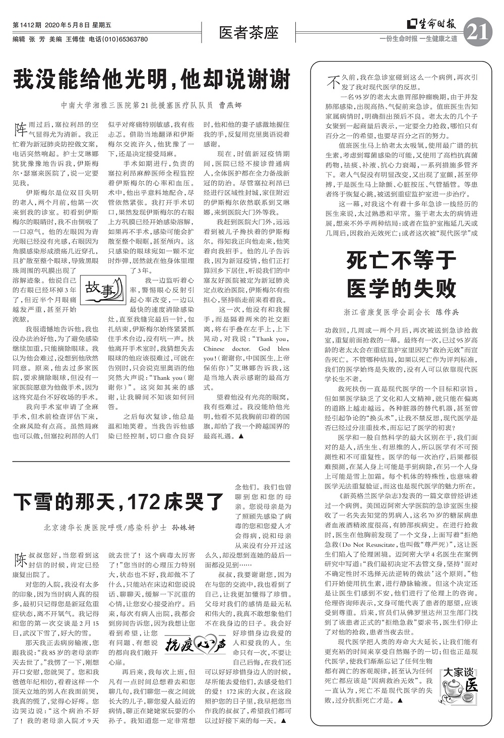 我很遗憾地告诉他,我也没办法治好他,为了避免感染继续加重,只能摘除眼球。我以为他会难过,没想到他欣然同意。原来,他去过多家医院,要求摘除眼球,但没有一家医院愿意为他做手术,因为这终究是台不好收场的手术。