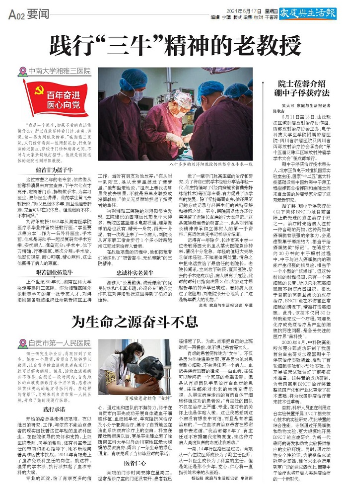“一辈子听党话跟党走,只要我活着一天,就要为党和人民做一天贡献;我是一个医生,如果不看病我还能做什么?所以我就坚持看门诊、查房、听课,做一些力所能及的事。”在湘雅三医院,人们经常看到一位两鬓花白、行色匆匆的老医生,穿梭于门诊和病房之间,不时与大家亲切地打招呼。他就是该院退休的老院长刘浔阳教授。