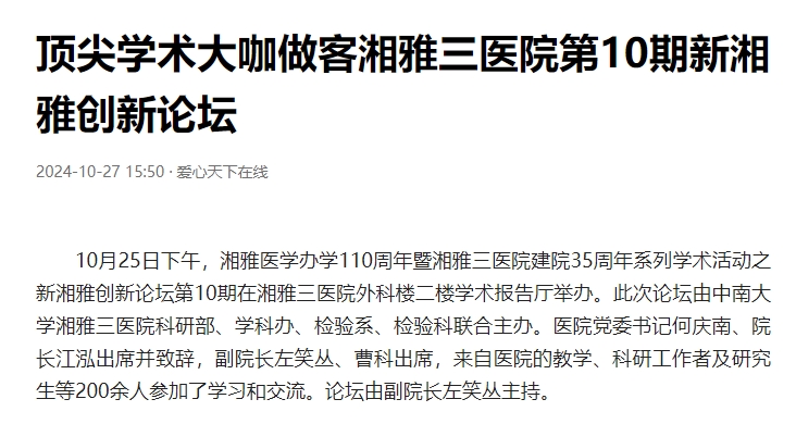 人民网 | 新华网 | 中华人民共和国国家卫生健康委员会 | 中华人民共和国教育部 | 湖南省政府 | 红网 | 湖南省卫生健康委员会 | 湖南省教育厅 | 中南大学 | 湘雅医学院 | 湘雅医院 | 湘雅二医院 | 协和医院 | 华西医院 | 西京医院 | 瑞金医院 | 复旦中山医院 | 武汉同济医院 | 中山医院