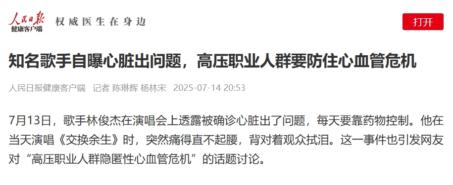人民日报健康客户端:知名歌手自曝心脏出问题,高压职业人群要防住心血管危机