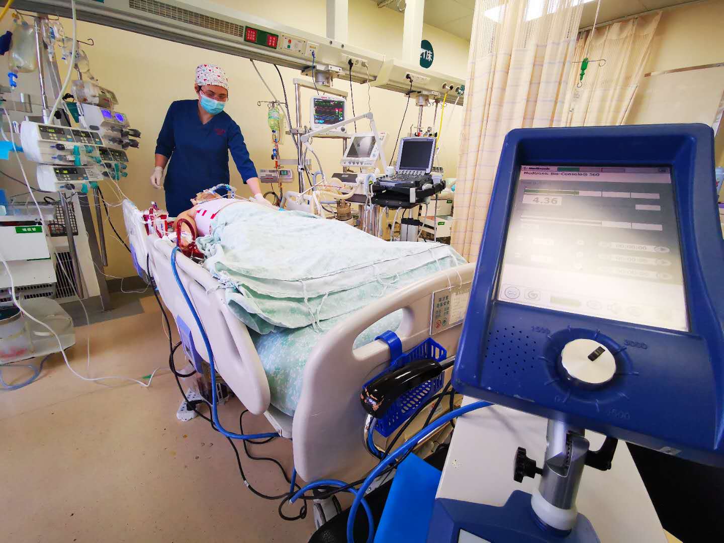 31岁的小勇在5月3日驾驶摩托车时不幸摔伤,后因胸腹部疼痛、气促进行性加重被紧急送往中南大学湘雅三医院急诊科,急诊科主任孙传政所带领的创伤团队接诊后迅速启动了创伤患者抢救流程,以最快的速度诊断出食管破裂、血气胸。由于病情十分危急,需要行紧急开胸手术,而在此时,患者的呼吸、心率、血压、血氧饱和度都极不平稳,手术风险极高。创伤团队的专家金龙玉主任临危不乱带领团队为患者在全麻下实施胸腔镜辅助下右侧开胸探查手术。术中发现患者食管有巨大穿孔,大量胃酸、食物残渣已进入胸腔,肺部感染、胃酸腐蚀肺部极其严重。金龙玉为患者一点一点清除胸腔中的异物,反复进行胸腔冲洗。麻醉科主任廖琴带领麻醉团队精准调控、适度麻醉,为手术全程护航,手术完毕已是凌晨4点。虽然,手术实施得很成功,可小勇的病情却没有明显好转,因为他的肺部被胃酸严重腐蚀,几乎没有了功能,整个机体处于极度缺氧状态。实施手术的医生团队不约而同决定将患者转入急危重症监护中心ICU。