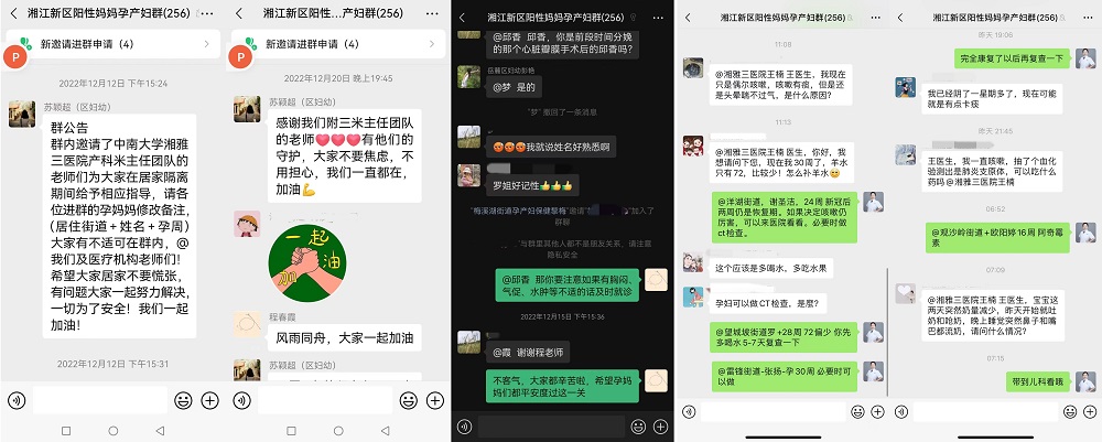 新冠病毒播散速度快,但是孕产期的特殊性导致病情不能延误。产科联合湘江新区妇幼保健社区管理部门建立了微信问诊联系群,群内孕产妇近300人。产科医护人员利用休息时间答复群内问题,平均每日回复超过200条,让孕妈妈们足不出户解决基本的医疗疑问,也能及时发现高危情况提醒就医。