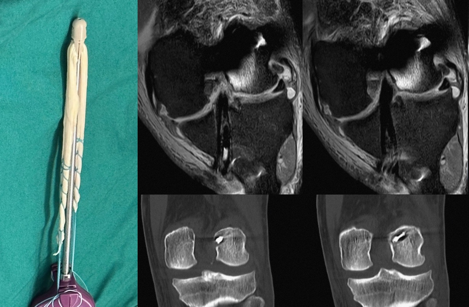 这名接受治疗的患者曾因踢足球而扭伤膝关节,运动时时常出现膝关节疼痛和不稳定感,经检查后诊断为“左膝前交叉韧带断裂”。经骨科主任吴松评估后,考虑到患者具有较高的运动需求,科室讨论决定采用最新引进国内的AperFix韧带固定装置。7月11日上午,在吴松主任及沈民仁副教授指导下,由何金深副研究员主刀,带领王梓力博士及梁驰博士等运动医学团队核心成员成功为其实施了AperFix前交叉韧带重建手术(术后核磁共振及CT影像学如下图所示),这也开创了省内前交叉韧带新型固定方式的先河。