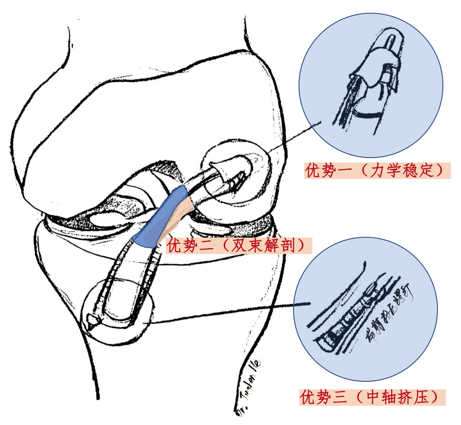 据何金深介绍:AperFix前交叉韧带重建手术是近年国际上开展的一种基于新型固定装置与固定方法的前交叉韧带重建术式,与传统术式相比具有明显优势。首先,相较于传统的固定方式,这种股骨撑开的固定方法有着更高的生物力学性能,即更强的稳定性,因此极少出现肌腱重建后股骨端的蹦极效应与雨刮效应等并发症。其次,该术式下的移植肌腱分成4股折叠在固定装置上,术者可通过调整肌腱植入角度,更精确模拟前交叉韧带的双束解剖结构。此外,该术式胫骨部分中轴挤压固定的特性能够将移植肌腱环形压缩,从而使骨肌腱结合面最大化,最终减少骨腱愈合时间,有利于患者更快地进行康复训练。因此,该新技术的成功开展,标志着膝关节韧带损伤患者今后将可能获得更好的预后。