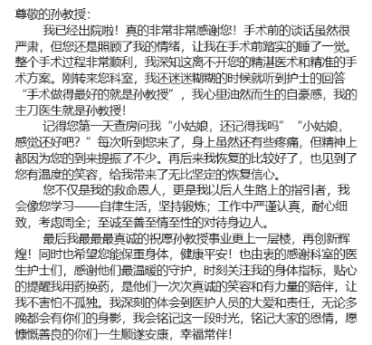 即使顺利达成预计手术目标,术后的恢复亦不是一帆风顺。一旦出现十二指肠瘘、胰瘘、胆瘘等严重并发症,也可能为患者带来生命危险。在肝胆胰外科二病区医护团队齐心协力的照护下,患者术后并未出现严重并发症,但仍出现了胃排空延迟这一功能障碍。经过三周积极对症治疗后,患者并发症情况明显好转,并于12月20日康复出院,也留下了开始提到的那封发自肺腑的感谢信。