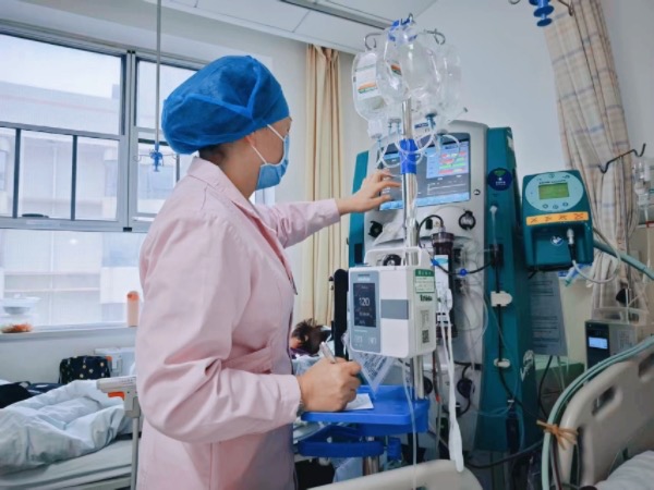 大年初一,两名重症患者感胸闷气促不适,血钾偏高,病情较重。总住院唐娟医师查看每一位重症患者的生命体征、容量状态及治疗反应,仔细评估血滤参数与病情变化,精准调整治疗方案,血滤护士骆绍琴接到行床旁血滤治疗通知后,装好血滤管道,调整参数,迅速上机,并安抚患者及家属,积极配合治疗,病情很快会好转。