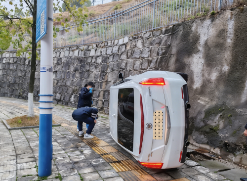 抵达现场时,侧翻的车辆横在人行道上,车身严重变形,现场有交警维持秩序。身着 “中国急救” 制服的医护人员没有丝毫迟疑,立即投入紧张的救援工作。他们分工协作,有的俯身探查车内被困人员的生命体征,有的快速评估现场环境、排除二次伤害隐患,有的准备急救设备随时待命。从靠近车辆到初步处置,每一个动作都娴熟专业,每一个环节都有条不紊,尽显湘雅急救人的专业素养。