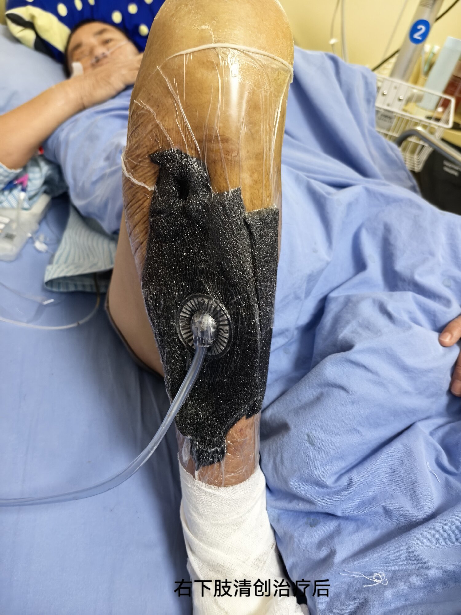 经过前期系列治疗,患者病情已明显好转,肝功能、血小板基本恢复正常,但右下肢水肿、胀痛症状持续加重,经多次换药治疗后效果不佳。此时患者病程较长,右下肢感染病灶范围广泛,炎症坏死情况突出,若不及时有效处理,可能导致感染复发甚至肢体坏死。烧伤科专家会诊评估后,明确手术指征,随后先后为患者实施三次手术清创+负压引流术,术中成功克服出血、低血压等突发情况,彻底清除了脓肿及坏死组织;因患者手术创面及皮肤缺损范围较广,后续又实施了第四次右下肢自体皮移植手术,有效促进创面愈合,彻底解决了右下肢感染隐患。
