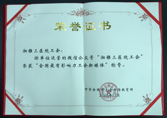 12月17日,“凝神•聚焦•发力”首届全国最有影响力工会新媒体论坛在浙江长兴举行。我院工会微信公众号“湘雅三医院工会”在全国各行业工会系统1300余个微信公众号和800余个微博账号中排行第75位,是全国卫生系统唯一跻身前100名的工会微信平台,荣获“全国最有影响力工会新媒体”称号。此次湖南省跻身全国前100名的共有三家:浏阳市总工会、湖南省直工会、湘雅三医院工会。