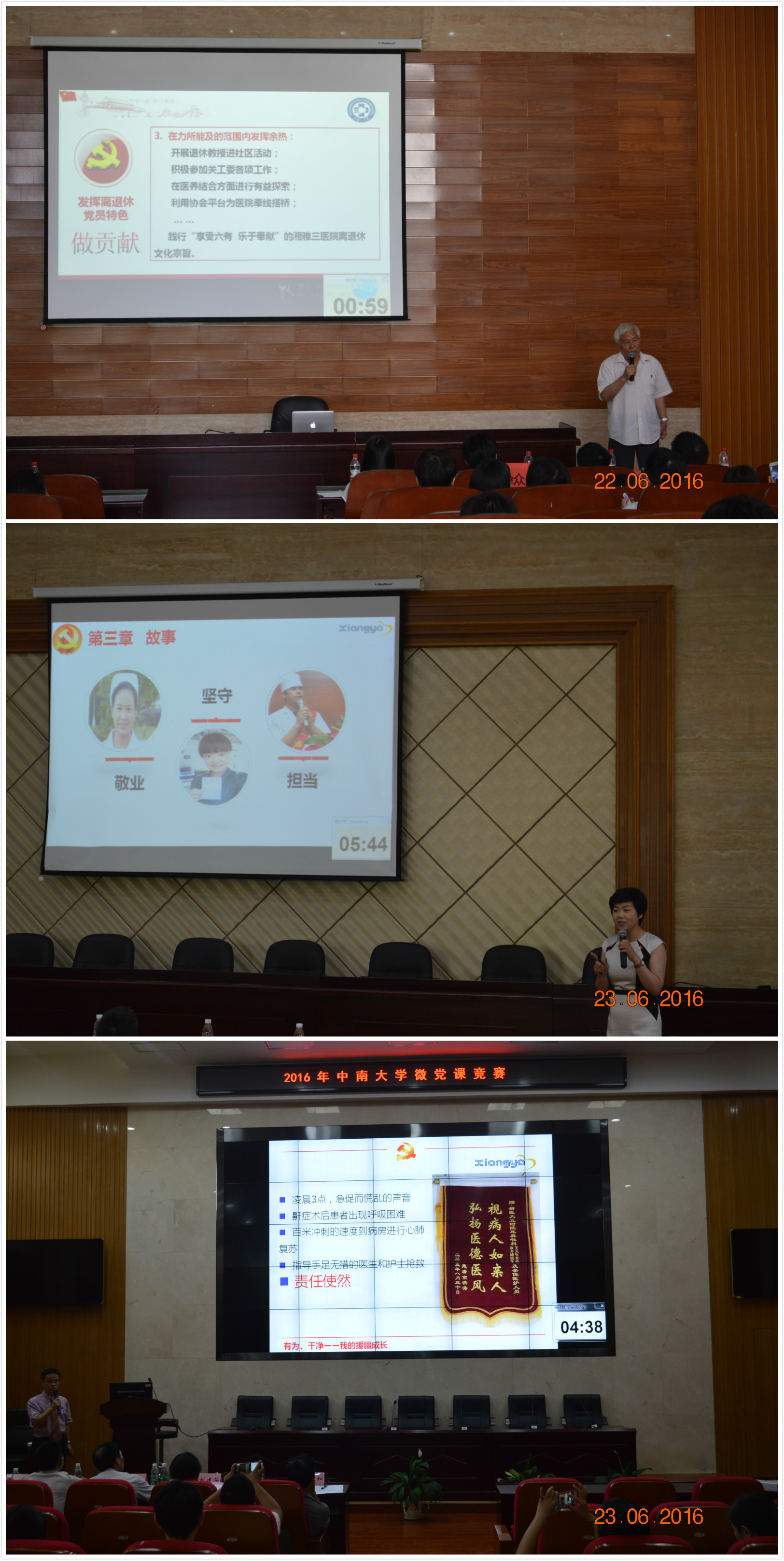 离退休党支部杨伯勋书记、第九党支部向亚利科护士长、第四党支部耳鼻喉科王天生副教授代表我院,分别从《重温党章党纲,弘扬奉献精神》、《守一种精神,做一名“天使”》、《亮党员身份、做担当医生》3个主题在3个赛场参加复赛,他们立足自己的亲身经历和身边的先进事迹,精神饱满,主题鲜明地进行了精彩的讲授与展示。