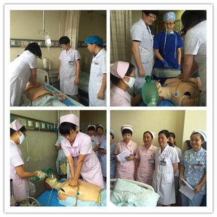本病房护士在发现患者呼之不应,颈动脉搏动消失时,立即呼救,启动紧急抢救流程,病房值班医生两人,一名床旁查看病人,协助完成初级生命支持,另一名立即呼叫上级医师、ICU及麻醉科总住院及护士长。护士长协助调配19及21病区的护士及本病区护士支援。ICU及麻醉科总住院5分钟内到达演练现场,和上级医师一起下达指令,配合此次演练。此次演练共完成了基础生命支持---胸外心脏按压及简易呼吸气囊辅助呼吸、电除颤、各种复苏药物的使用,以及在麻醉科的配合下完成气管插管,建立 人工气道等各项生命支持措施。