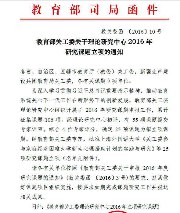 2016年2月,为深入学习贯彻习近平总书记重要指示精神,推动教育关工委工作在新形势下创新发展,教育部关工委决定进一步发挥教育关工委和“五老”优势,围绕深入推进立德树人、有效加强青少年思想道德建设开展理论研究。累计征集课题106项,初审评选出55项,终审25项课题立项,湘雅三医院课题排名第六位。
