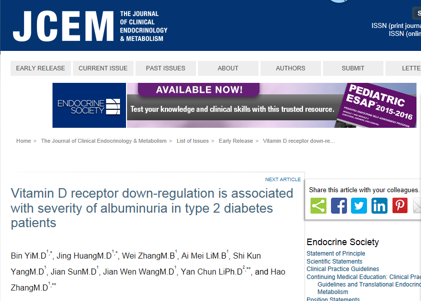 中南大学湘雅三医院张浩教授带领肾内科科研团队,经过长达五年的临床与基础研究,对健康人、早期糖尿病肾病及中晚期糖尿病肾病患者进行对比,发现糖尿病肾病患者外周血单个核细胞中维生素D受体下调与蛋白尿严重程度相关。团队主要研究者张浩教授、易斌副教授为主撰写的相关文章“Vitamin D Receptor Down-regulation Is Associated with Severity of Albuminuria in Type 2 Diabetes Patients”发表在SCI权威杂志内分泌学与代谢分类下的2区期刊JOURNAL OF CLINICAL ENDOCRINOLOGY & METABOLISM上(IF 5.531)中,该项研究结果对于糖尿病肾病临床治疗有重要的指导意义,是糖尿病肾病炎症研究领域的新突破。