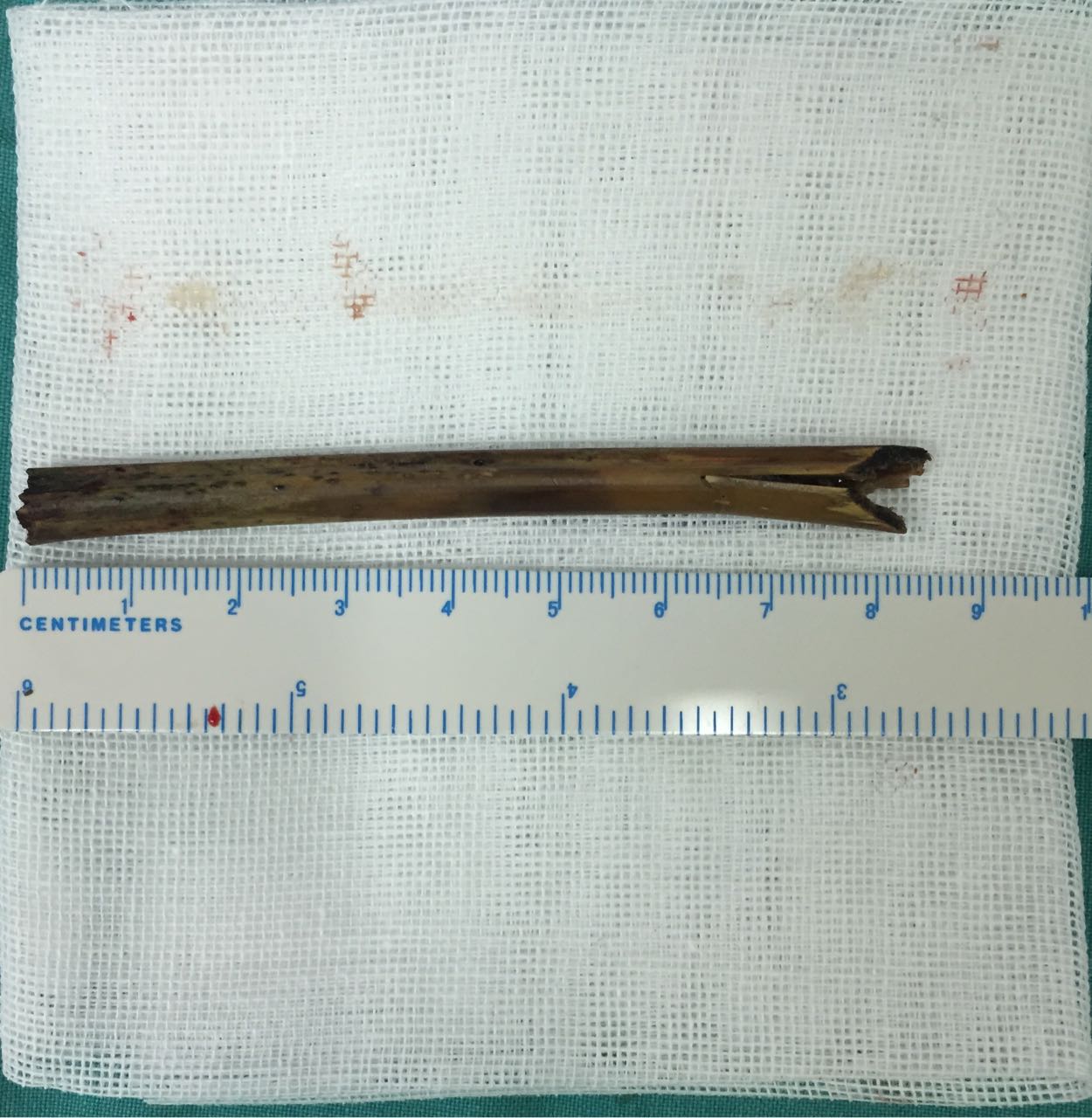手术开始,发现患者面颊部的伤口只有一个针眼大的口子一直流出大量恶臭的脓液。谭教授仔细分离创口周围的疤痕肉芽组织,将异物的尾巴分离出来,异物被大量的肉芽包裹,并形成了一个直通颅底的隧道。将异物游离出来后小心翼翼地试探性往外拔出一点异物,所幸异物与周围的动脉粘连不紧,观察没有大的出血及生命体征改变后轻松地将全部异物取出来。检查异物无残留,又无活动性出血后,大家高悬的心终于放了下来。