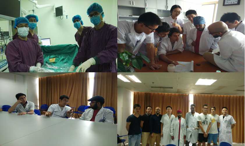 尽管实习时间仅有短短一个月,但在聂晚频主任和其他主诊医师的大力支持下,肝胆胰外科的教学团队一丝不苟地筹划教学方案。他们每天在面对外科工作压力的同时,还要绞尽脑汁去思考如何让留学生们在这里学习和生活得更好。每天清晨在聆听完科室交班后,每位留学生会由一名教授或主治医生带领查房,在查房的过程中我们的教授及主治医生会用英文向他们介绍本科室常见病的诊断与治疗,同时这些留学生们也会发表他们自己的看法以及这些疾病在他们国家的发病与治疗状况。其中汪长发、孙吉春、徐宏博等主治医生带领的小组讨论与师生互动最为热烈,每次都能赢得来自其他小组的一致好评。而看似平凡的讨论与师生互动却在无形中促进了中西方医学文化的交融。留学生们每天也会跟随小组医生进入手术室进行不同程度的操作锻炼,如消毒铺单、缝合、腹腔镜基本技术等操作。理论与实践相结合的教学模式使留学生取得了意想不到的进步。湘雅人严谨的治学态度和无私奉献精神亦给留学生留下了深刻印象。