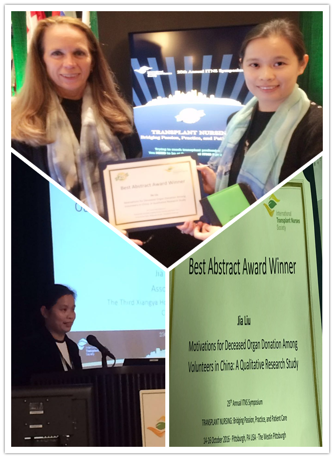 10月13-17日,由国际移植护士协会(International Transplant Nurses Society) 和美国护士学会 (American Nurses Association)共同主办的第25届世界移植护理大会在美国匹兹堡召开。我院移植科36病区护士长刘佳副主任护师作为唯一受邀的中国移植护理学者应邀参会,并围绕“肾移植随访病人的口服免疫抑制剂的服药依从性及其测量方法”作主题报告。会后,刘佳获得大会“Best Abstract Award Winner”的荣誉。