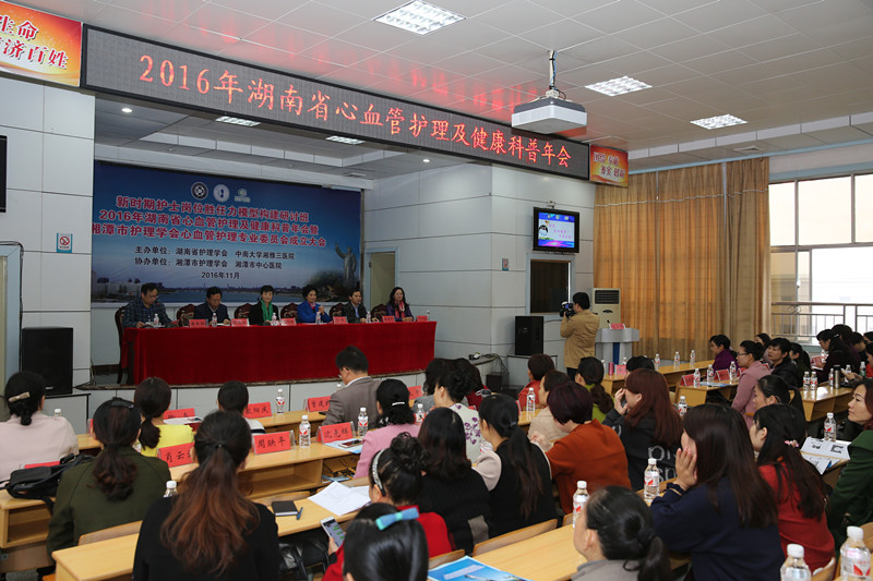 开幕式由湘潭市中心医院唐新桥副院长主持,曾建平院长致欢迎词。湘潭市卫生计生委陈建安副主任宣读《关于成立湘潭市护理学会心血管护理专业委员会》的文件。湖南省卫计委医政医管处监察专员曾清对会议的召开给予充分肯定,并对护理人员提出要求:希望大家与时俱进、立足岗位、创新发展,从“大健康、大卫生”的角度思考,如何满足人民群众的健康需求。湖南省卫计委巡视员、护理学会孙向明理事长指出:今年我国举行了建国以来卫生领域规模最高、规格最大的全国卫生与健康大会,习总书记、李总理亲临大会并做重要讲话,强调把人民健康放在优先发展的战略地位,对建设健康中国等重大任务作了明确、深刻的阐述,提出要将疾病预防的关口前移;护理人员是健康中国建设的一支主力军,承担着人类健康的社会责任;心血管疾病是危害人类健康的头号杀手,作为心血管护理人员责任重大,本次大会正是落实全国卫生与健康大会精神的有效举措,对推动基层护理及科普工作将起到引领作用。孙理事长对中南大学湘雅三医院近几年来在湖南省心血管护理和科普工作领域所开展的工作给予了高度评价。