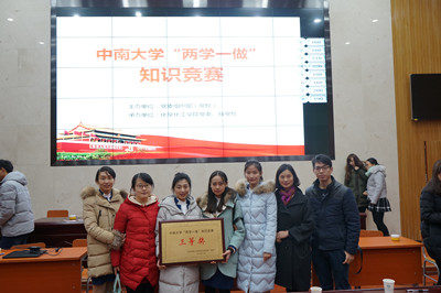 11月23日,中南大学党委组织部(党校)组织的“两学一做”知识竞赛决赛在新校区化学楼133报告厅成功举行。我院代表队以复赛总分第一的成绩入围决赛,并荣获三等奖。