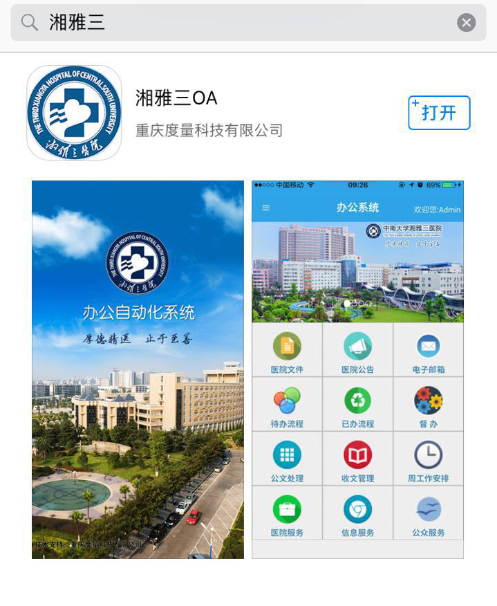 方法二:请在安卓手机应用宝或苹果手机appstore中搜索“湘雅三OA”进行安装。