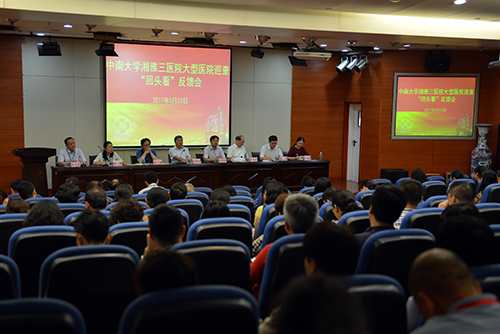 按照国家卫计委医政医管局工作部署,大型医院巡查“回头看”专家组于5月21日-23日对我院开展了巡查督导工作。并于5月23日上午举行反馈会。中南大学副校长陈翔,湖南省卫生计生委副主任龙开超,中南大学医院管理处处长张欣,湘雅三医院党委书记罗爱静、院长陈方平,巡查“回头看”全体专家,全体院领导出席。行政职能部门正副主任,党群部门正副主任及党支部书记,各教研室、临床医技科室正副主任,正副护士长近200人参加会议。反馈会由巡查“回头看”专家组刘贵祥组长主持。党风廉政组张雷、医院管理及行风组王吉善、经济管理组陆缨分别对我院“回头看”督查情况进行了反馈,全方位总结和概况了医院在党风廉政建设、“九不准”落实、医院管理及经济管理方面整改落实取得的成绩,同时也指出了医院在后勤保障、财务管理方面存在的不足,并对进一步持续整改工作提出了建议和意见。
