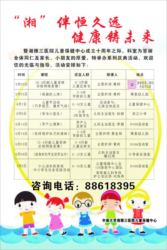 今年是湘雅三医院儿童保健中心成立十周年,近期,该科拟针对0-16岁的儿童举办9场不同形式的以“‘湘’伴恒久远,健康铸未来”为主题的庆典活动,活动时间为期一个半月,目前已举办三场。