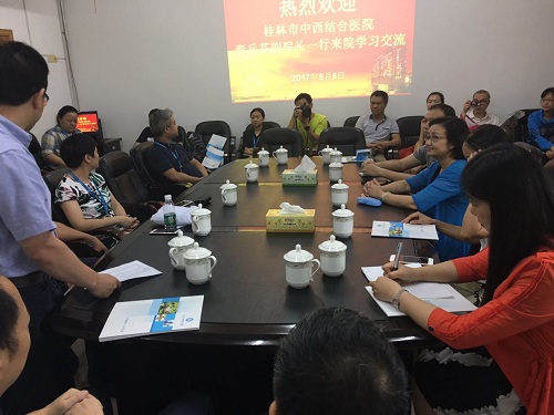 社会服务部主任赵颜忠、急诊科主任张天一、护理部副主任严谨、医保办副主任罗华、院感科副主任曾赛男等行政及临床科室专家与桂林中西结合医院就人员培训、远程医疗等方面进行了重点交流。