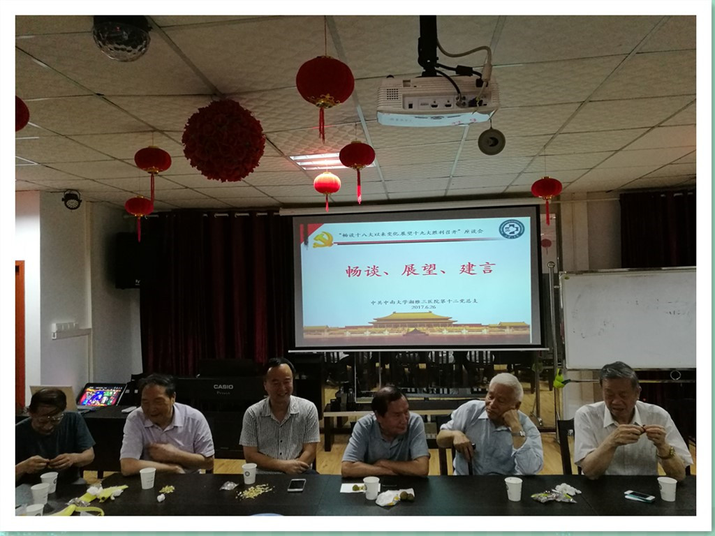 6月26日下午,我院离退休党总支(第十二党总支)在离退休多功能活动厅组织部分离退休党员代表召开“畅谈十八大以来变化·展望十九大胜利召开”座谈会。活动由第十二党总支书记杨华主持,主管离退休工作的党委副书记邓云龙参加,离退休第一、二、三党支部委员及杨伯勋、刘浔阳、郑兰香、陈伟中、李小如、陈道瑾等20多位退休党员参会。