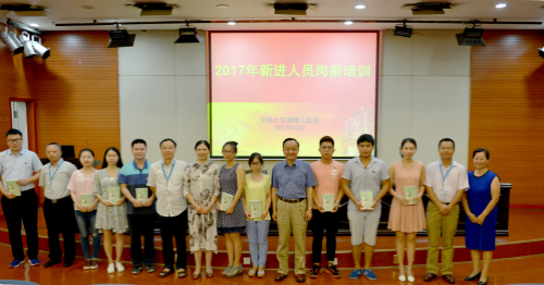 院领导还为新进人员代表授戴湘雅三医院院徽,赠送励志书籍《你终将成为让自己仰慕的人》,并与全体人员合影留念。