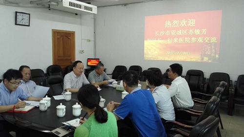 7月24日下午,长沙市望城区副区长苏敏芳带领区卫计局局长刘迎秋、区人民医院院长张曙林、区人民医院办公室主任王英等4人来到湘雅三医院交流医联体建设工作。在综合楼三楼一会议室,院长陈方平、副院长黄飞舟、院长助理范自力以及社会服务部主任赵颜忠、副主任万响参加了座谈。