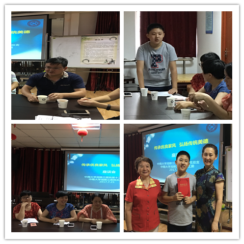 与会代表踊跃发言。退休老同志巫爱琳讲述“嗑瓜子”和“分鱼”两个故事,老伴朱雪阳教授有“嗑瓜子神技”,嗑过的瓜子完整如新,嗑后他偷偷放到盘子里,女儿不知晓抓了吃,发觉不对也如法炮制,父女互相逗乐。巫老师通过故事分享了家庭的和睦、欢乐与幽默。杨建叔同志介绍了杨家家训:“家勤则兴,人勤则健,人能勤俭,永不贫贱”,她家三兄妹对父母孝顺细分到日常生活,还为了回家唱歌给父亲听参加医院老年大学声乐班学习。 最小代表小学六年级学生刘丞罡朗读了自己写作的“我的爸爸”一文,并对“仁义礼智信”作了自己的解读,他说父亲是他的好榜样,优良家风代代传承。