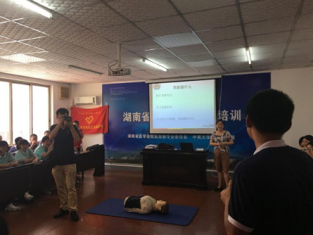 培训导师康晓艳详细讲解了心肺复苏操作要点且进行心肺复苏实际演练教学: