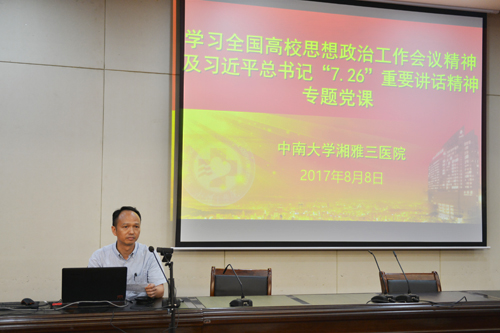 8月8日晚,中南大学湘雅三医院组织全体党员开展主题党日活动,学习全国高校思想政治工作会议精神及习近平总书记“7.26”重要讲话精神。活动设1个主会场,18个网络视频直播分会场。全体院领导,行政职能部门正副主任,党群部门正副主任及党总支书记,各教研室、临床医技科室正副主任,正副护士长,全体党员共1000余人参加了活动。活动由党委副书记、纪委书记吴希林主持。