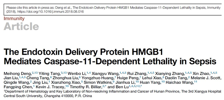 近日,中南大学湘雅三医院血液内科吕奔教授团队在国际免疫学顶尖期刊《Immunity》(IF=19.734)上在线发表学术论文“The Endotoxin Delivery Protein HMGB1 Mediates Caspase-11-Dependent Lethality in Sepsis”。该论文的第一单位为中南大学湘雅三医院。邓美虹和唐怡庭博士为并列第一作者。吕奔教授和匹兹堡大学学者为共同通讯作者,其中吕奔教授为主要联系人(Lead contact)。
