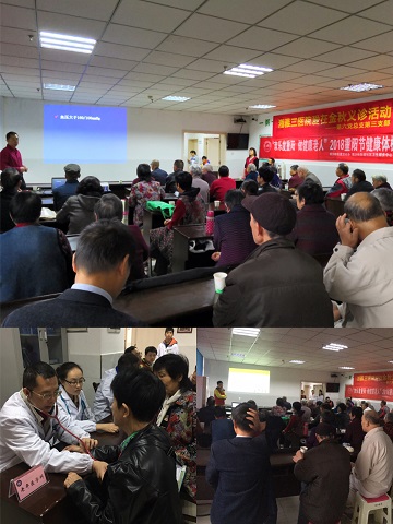 欧阳茂和马鑫医生的健康讲座推出由老人引领家庭生活,提高全家健康水平的理念,通俗易懂地讲解了老年高血压和睡眠健康相关知识,讲座生动有趣,图文并茂,既普及健康知识,强调改变不良的生活方式,又特别注重提高社区老年高血压和睡眠障碍患者的自我保健能力。整个讲座座无虚席,反响热烈,在爷爷奶奶的热烈掌声中结束讲座后,医护人员开始了义诊,爷爷奶奶有序的排队根据自身健康情况选择不同的科室医生进行义诊,医护人员热情地询问老人的身体状况,并测量血压,体格检查,细致地对老人关心的问题进行耐心的解答和指导。老年病科家属也积极参与此次活动,义诊中孩子们的加入和导引,展现了“尊老,敬老,爱老”代代传承的喜人景象。