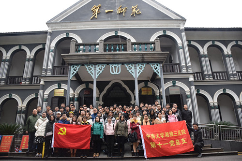 为进一步深入推进“两学一做”学习教育,以生动形象的方式教育党员,12月8日,中南大学湘雅三医院第十一党总支开展“不忘初心、牢记使命”主题教育党日活动。学生总支80余名党员及入党积极分子,冒着冷冽的寒风,满怀激情和敬意,来到毛泽东与第一师范纪念馆参观学习。