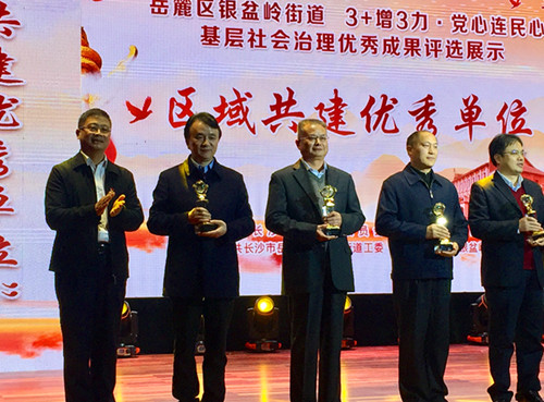 长沙市委组织部副部长、市委基层办主任杨俊为湘雅三医院、湖南日报社长沙分社、湖南省科技厅等10家区域共建秀单位颁奖。