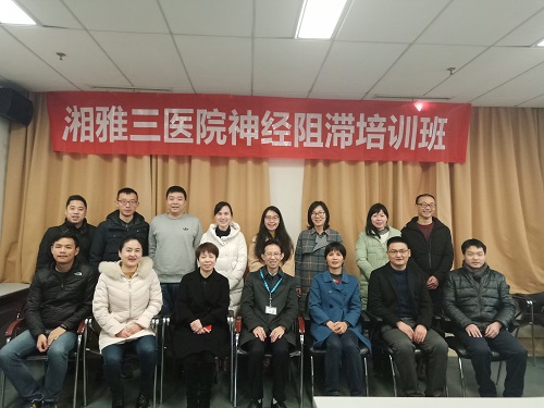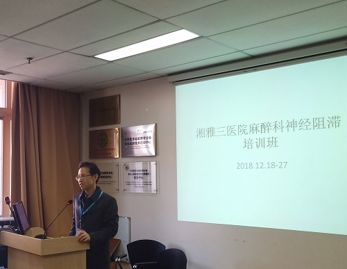 12月18——27日举办了第一期超声引导的神经阻滞实操培训班,来自湖南省三甲医院的8位麻醉科骨干,其中包括4位麻醉科主任全程参加了为期10天的培训。开班仪式由麻醉科副主任廖琴主持,副院长欧阳文致欢迎辞。