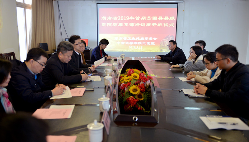 3月18日,由中南大学湘雅三医院承办的湖南省2019 年首期贫困县县级医院肺康复师培训项目开班仪式在外科楼十九楼举行。湖南省卫生健康委医政医管处副处长李世忠,湘雅三医院党委委员、副院长欧阳文,医务部主任张翼,护理部主任严谨,康复科主任李旭红,呼吸内科副主任刘纯,护理教研室副主任易琦峰及湖南省2019 年首期贫困县县级医院肺康复师培训班全体学员参加开班仪式,项目负责人严谨作主持。