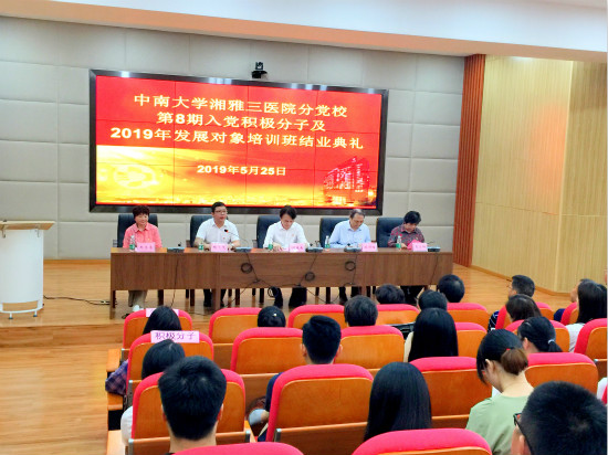 5月25日,中南大学湘雅三医院分党校第八期入党积极分子及2019年发展对象培训班结业典礼在科教楼三楼会议室举行。医院分党校校长、党委书记何庆南,分党校副校长、党委副书记杨飞龙,特邀党建组织员刘浔阳、郑兰香、巫爱琳出席结业典礼。各党总支书记、党办、宣传部、团委等相关职能部门负责人及全体学员参加结业典礼。