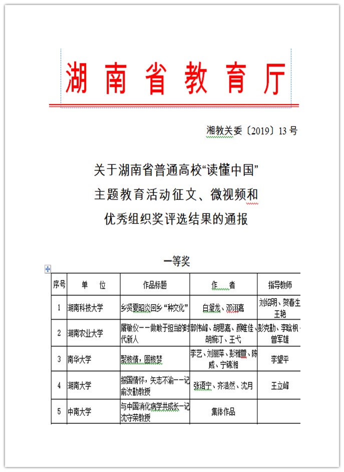 9月19日,中南大学湘雅三医院收到上级文件,以退休党员沈守荣教授为原型的微视频《沈守荣:与中国消化病学共成长》获得湖南省教育厅“关于全面开展“读懂中国”活动” 微视频比赛一等奖。