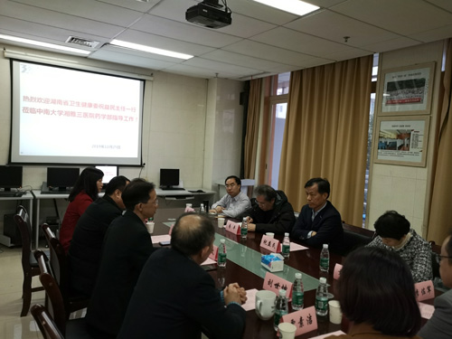 11月25日下午,湖南省卫生健康委副主任祝益民及药政处处长易平一行6人来到中南大学湘雅三医院药学部进行调研。湘雅三医院党委委员、副院长欧阳文,党委委员、副院长邓云龙,及药学部正副主任和部分科员参加会议。