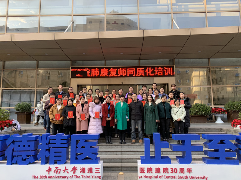 根据《湖南省2019 年贫困县县医院呼吸内科建设项目工作计划的通知》安排,委托中南大学湘雅三医院牵头举办2019年第三期贫困县县级医院肺康复师培训班,于10月开班,12月结业,共培训湘西1家(保靖县)、湘中10家(武冈市、城步县、邵阳县、新邵县、隆回县、洞口县、新宁县、绥宁县、涟源县、新化县)、湘北5家(石门县、安化县第二人民医院、平江县、茶陵县、炎陵县)等16家县级医院的32位学员。培训结束时由省卫生健康委医政医管处组织理论与实操考试考核后颁发《湖南省肺康复师同质化培训班合格证》,并作为通过省内肺康复师上岗培训的依据。至此,医院圆满完成卫健委委托湘雅三医院的48个贫困县96位肺康复师的全部培养工作。