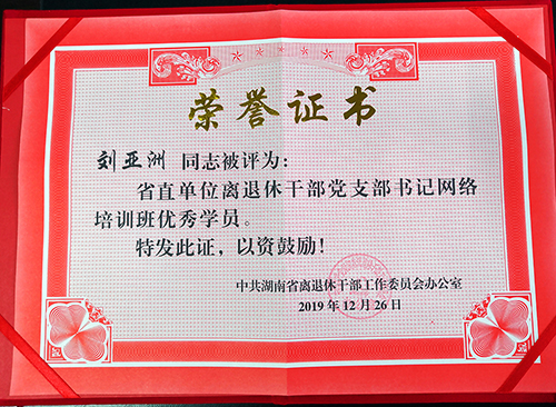 12月26日上午,中南大学湘雅三医院第十二党总支第二党支部书记刘亚洲在中南大学离退休处党委副书记何桂强陪同下,来到湖南省老干部活动中心金秋楼,参加省直及中央在湘有关单位离退休党支部书记网络培训班结业仪式,并接受表彰。刘亚洲书记作为中南大学唯一代表荣获优秀学员荣誉。