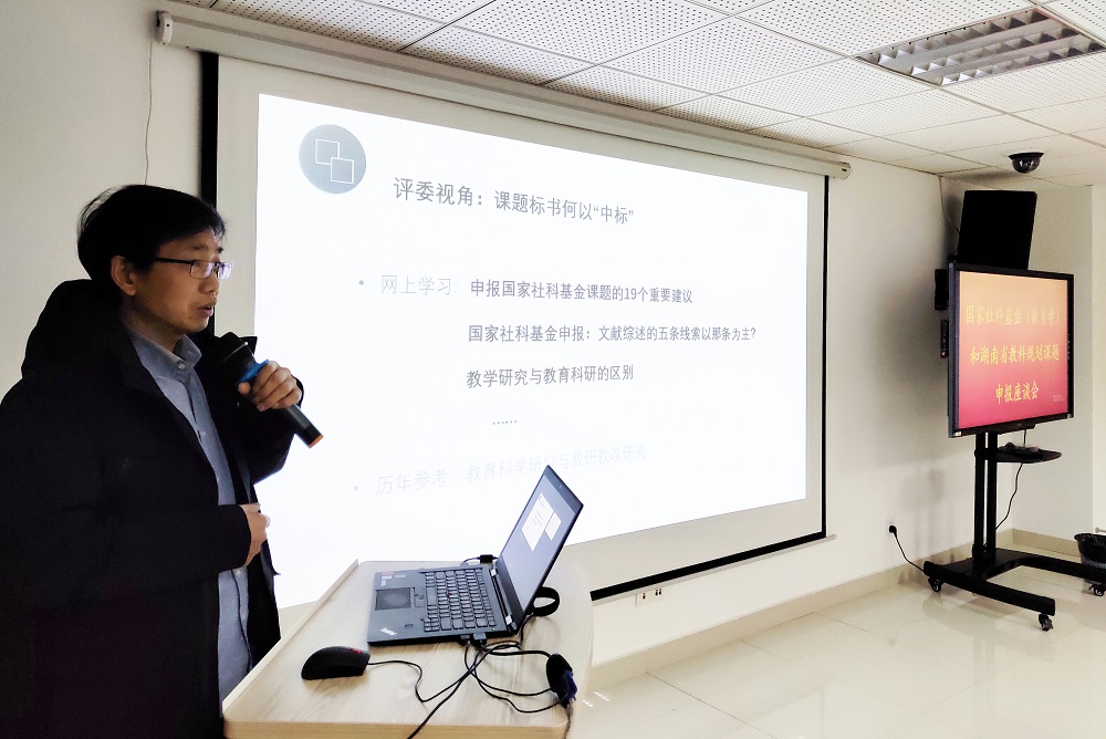 黄龙威副主任首先向参会教师传达了国家及湖南省教育科学规划有关精神,随后,结合具体案例就研究课题的选题及研究综述、研究价值、研究内容等的撰写作了详细的指导。