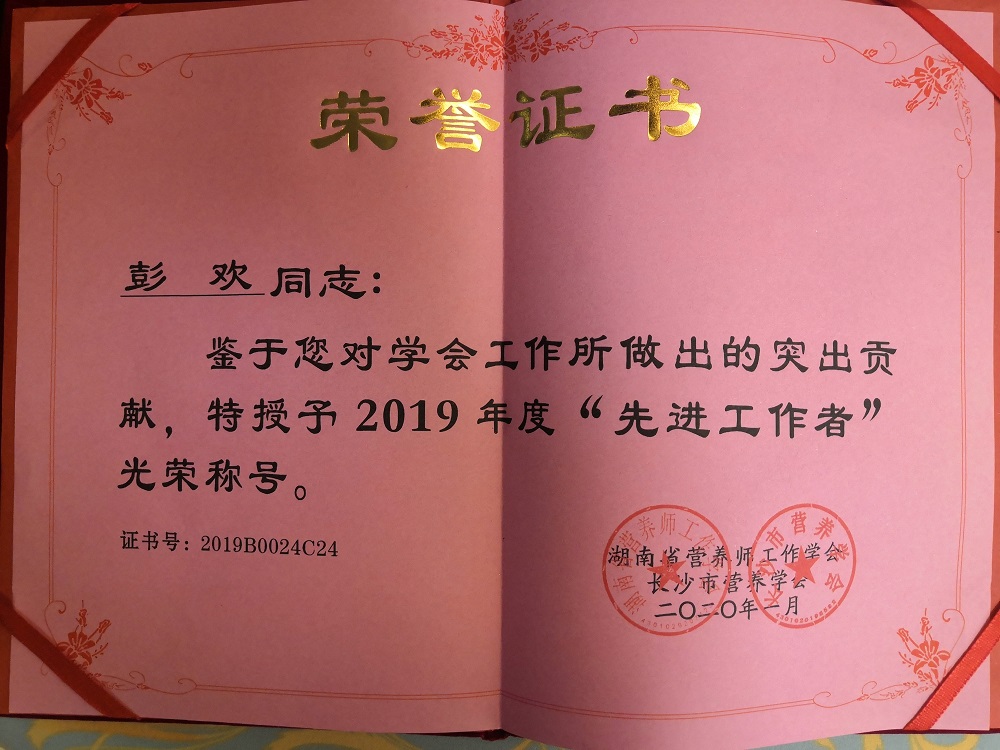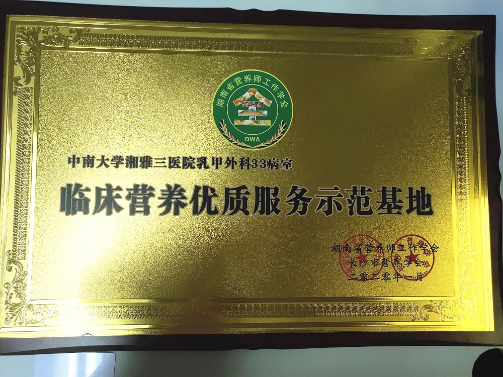 1月14日,“湖南省营养师大会”暨助力“健康湖南行动”启动仪式召开,开幕式由湖南省营养师工作学会,长沙市营养学会主办,湖南省预防医学会,湖南省科普作家协会,湖南省运动养生协会共同协办。中南大学湘雅三医院乳甲科33病室被评为“临床营养优质服务示范基地”,同时,医院乳甲外科主管护师彭欢也获得了2019年度湖南营养师工作学会、长沙市营养学会“先进工作者”的荣誉。